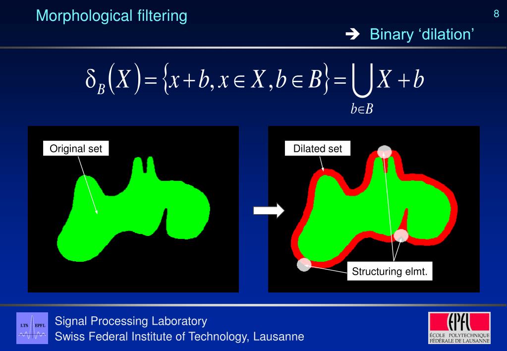 Morphological filtering What is it ? • Morphological filtering is a filtering method originated from the theory of mathematical morphology. • The base of all morphological processing are the ‘erosion’ and ‘dilation’ morphological functions.