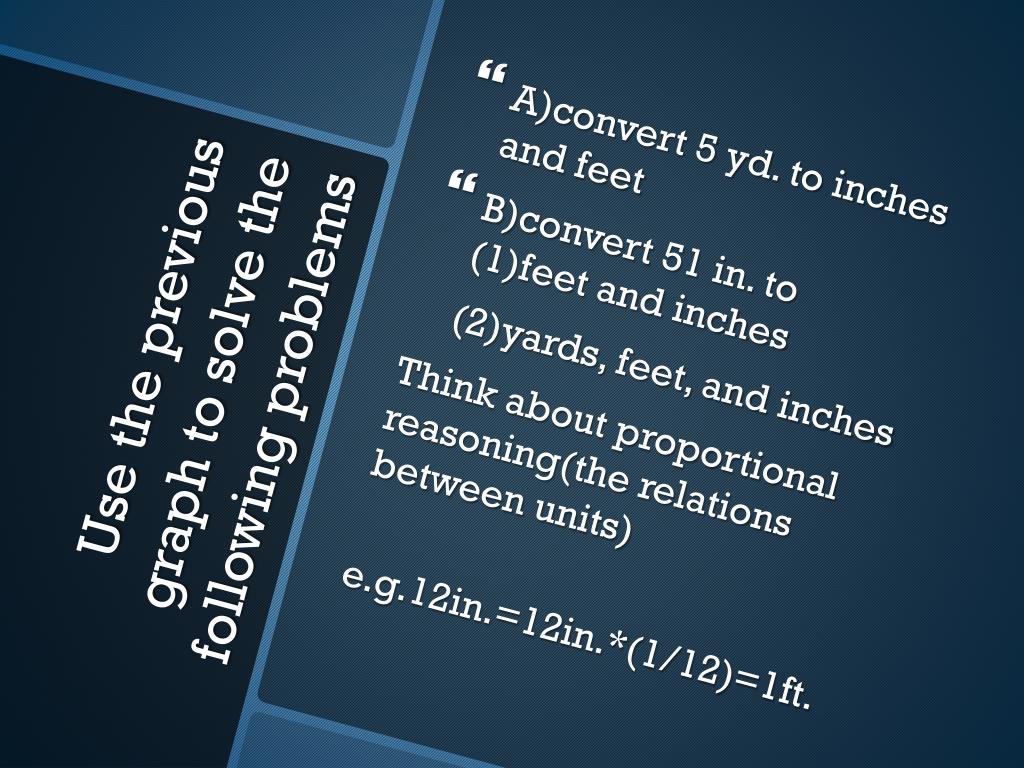 A)convert 5 yd. to inches and feet • B)convert 51 in. to (1)feet and inches (2)yards, feet, and inches Think about proportional reasoning(the relations between units) e.g.12in.=12in.*(1/12)=1ft. Use the previous graph to solve the following problems