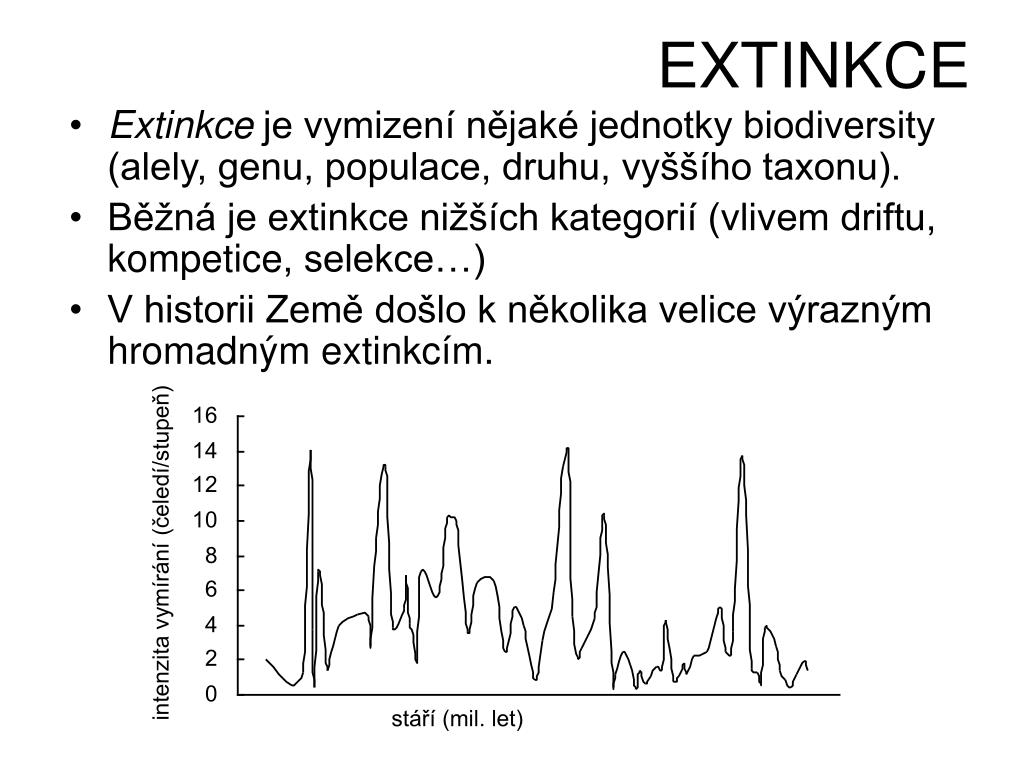EXTINKCE • Extinkce je vymizení nějaké jednotky biodiversity (alely, genu, populace, druhu, vyššího taxonu). • Běžná je extinkce nižších kategorií (vlivem driftu, kompetice, selekce…) • V historii Země došlo k několika velice výrazným hromadným extinkcím. intenzita vymírání (čeledí/stupeň) stáří (mil. let)