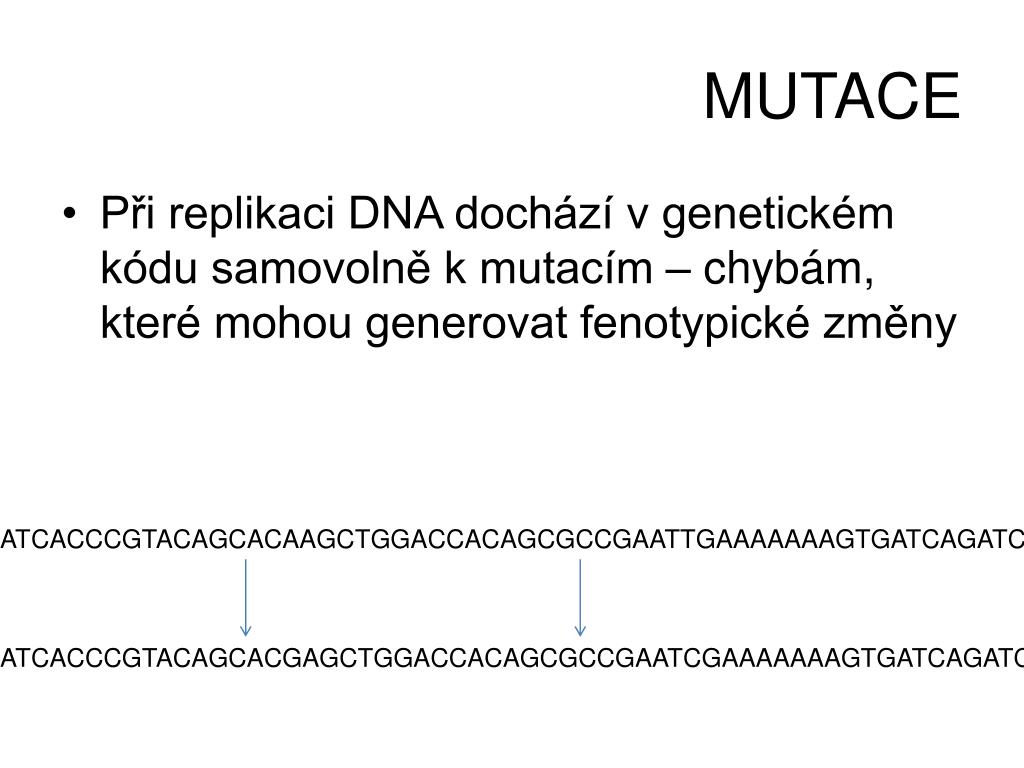 MUTACE • Při replikaci DNA dochází v genetickém kódu samovolně k mutacím – chybám, které mohou generovat fenotypické změny ATCACCCGTACAGCACAAGCTGGACCACAGCGCCGAATTGAAAAAAAGTGATCAGATCAATCATACATG ATCACCCGTACAGCACGAGCTGGACCACAGCGCCGAATCGAAAAAAAGTGATCAGATCAATCATACATG