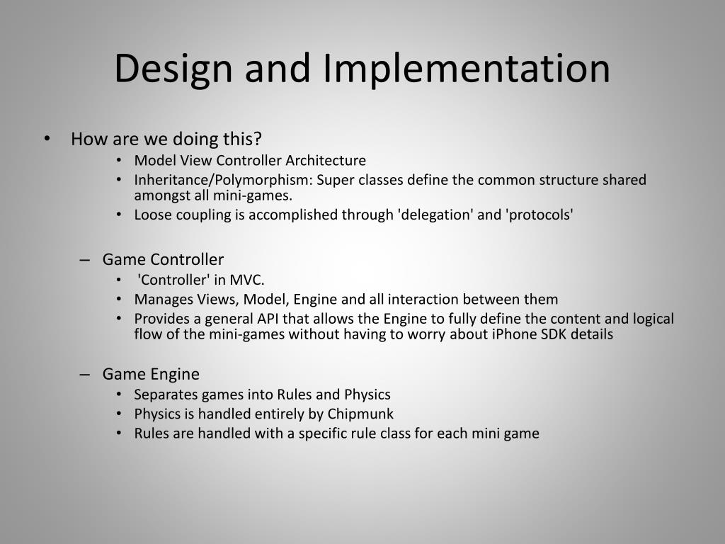 Design and Implementation • How are we doing this? • Model View Controller Architecture • Inheritance/Polymorphism: Super classes define the common structure shared amongst all mini-games. • Loose coupling is accomplished through 'delegation' and 'protocols' • Game Controller • 'Controller' in MVC. • Manages Views, Model, Engine and all interaction between them • Provides a general API that allows the Engine to fully define the content and logical flow of the mini-games without having to worry about iPhone SDK details • Game Engine • Separates games into Rules and Physics • Physics is handled entirely by Chipmunk • Rules are handled with a specific rule class for each mini game