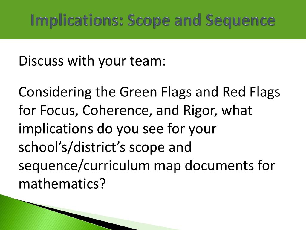 Implications: Scope and Sequence Discuss with your team: Considering the Green Flags and Red Flags for Focus, Coherence, and Rigor, what implications do you see for your school’s/district’s scope and sequence/curriculum map documents for mathematics?