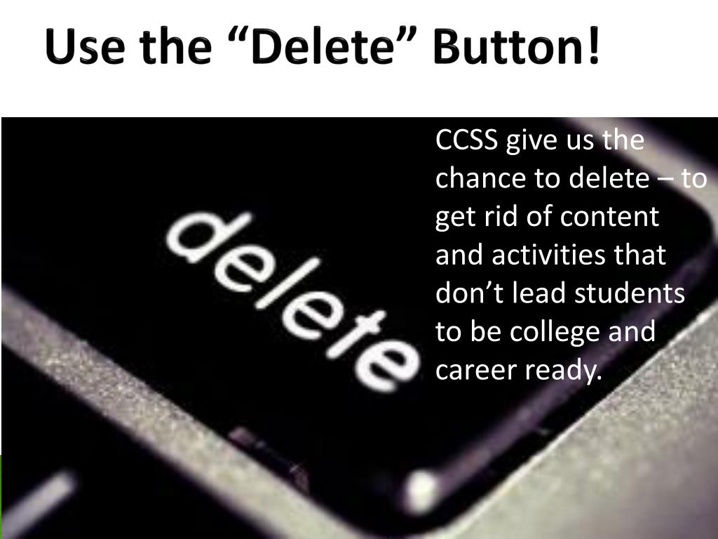 Use the “Delete” Button! CCSS give us the chance to delete – to get rid of content and activities that don’t lead students to be college and career ready.