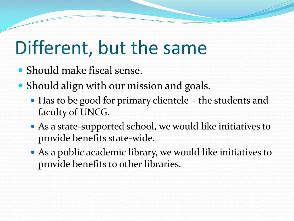 Different, but the same • Should make fiscal sense. • Should align with our mission and goals. • Has to be good for primary clientele – the students and faculty of UNCG. • As a state-supported school, we would like initiatives to provide benefits state-wide. • As a public academic library, we would like initiatives to provide benefits to other libraries.