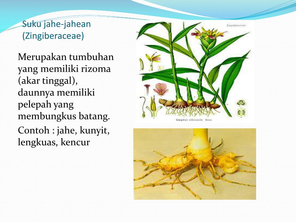 Sukujahe-jahean (Zingiberaceae) Merupakantumbuhan yang memilikirizoma (akartinggal), daunnyamemilikipelepah yang membungkusbatang. Contoh : jahe, kunyit, lengkuas, kencur