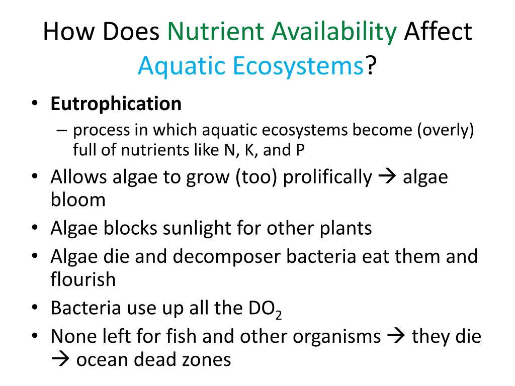 How Does Nutrient Availability Affect Aquatic Ecosystems? • Eutrophication • process in which aquatic ecosystems become (overly) full of nutrients like N, K, and P • Allows algae to grow (too) prolifically algae bloom • Algae blocks sunlight for other plants • Algae die and decomposer bacteria eat them and flourish • Bacteria use up all the DO2 • None left for fish and other organisms they die ocean dead zones