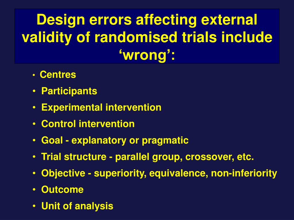 Design errors affecting external validity of randomised trials include ‘wrong’: • Centres • Participants • Experimental intervention • Control intervention • Goal - explanatory or pragmatic • Trial structure - parallel group, crossover, etc. • Objective - superiority, equivalence, non-inferiority • Outcome • Unit of analysis