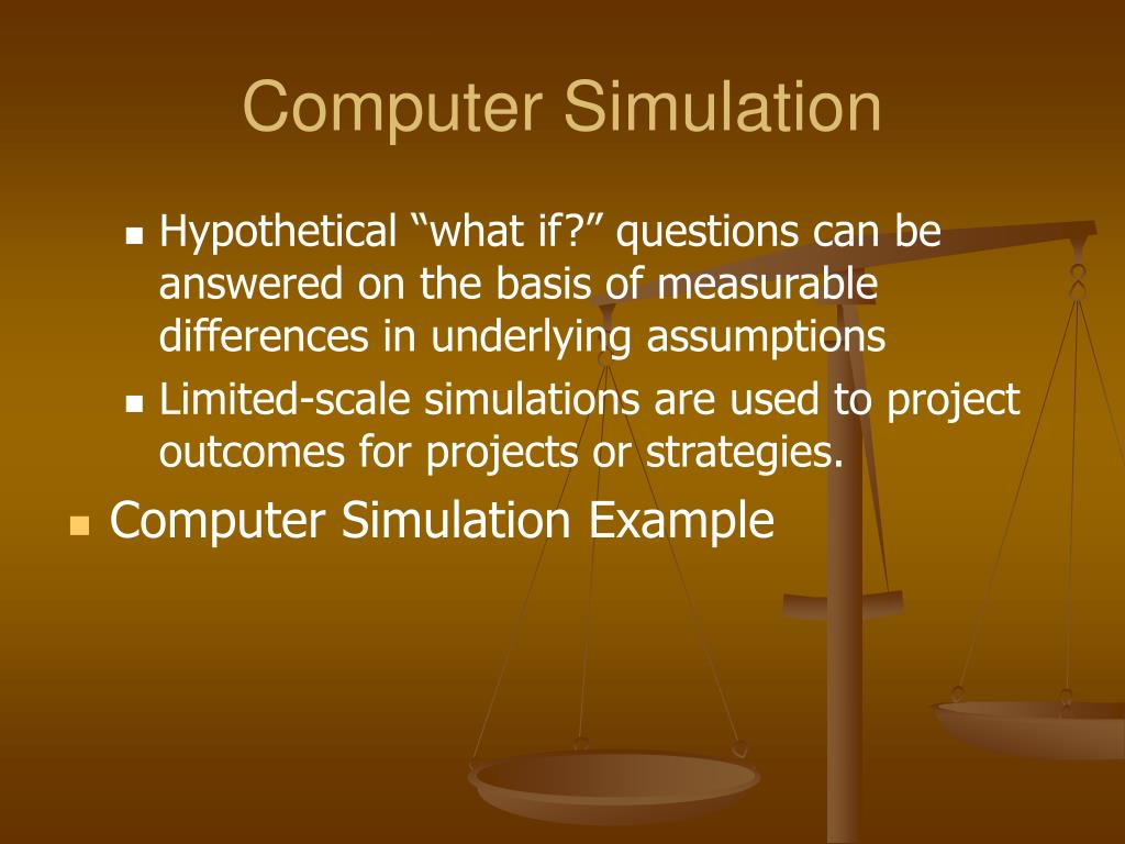 Computer Simulation • Hypothetical “what if?” questions can be answered on the basis of measurable differences in underlying assumptions • Limited-scale simulations are used to project outcomes for projects or strategies. • Computer Simulation Example