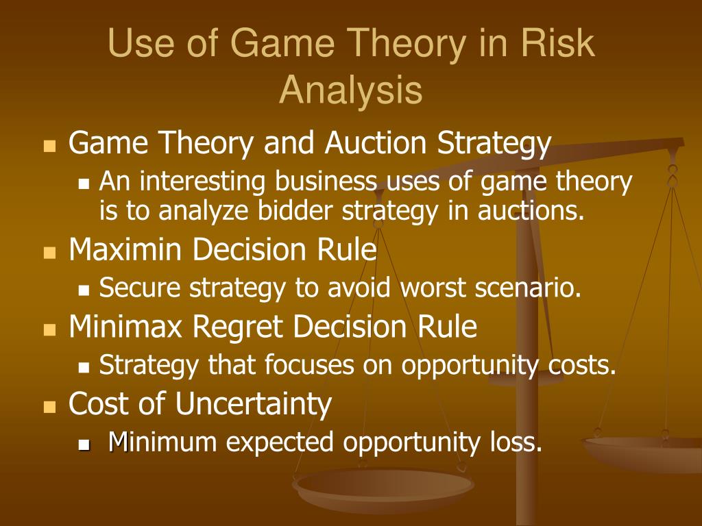 Use of Game Theory in Risk Analysis • Game Theory and Auction Strategy • An interesting business uses of game theory is to analyze bidder strategy in auctions. • Maximin Decision Rule • Secure strategy to avoid worst scenario. • Minimax Regret Decision Rule • Strategy that focuses on opportunity costs. • Cost of Uncertainty • Minimum expected opportunity loss.