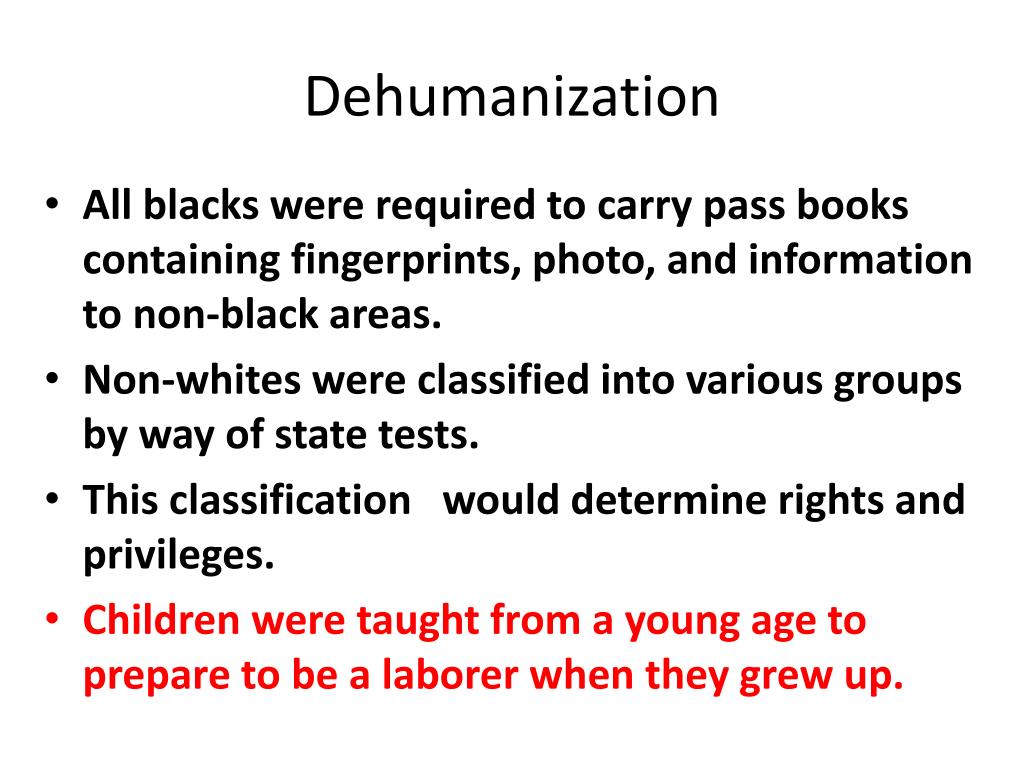 Dehumanization All blacks were required tocarry pass books containing fingerprints, photo, and information to non-black areas. Non-whites were classified into various groups by way of state tests. This classification would determine rights and privileges. Children were taught from a young age to prepare to be a laborer when they grew up.