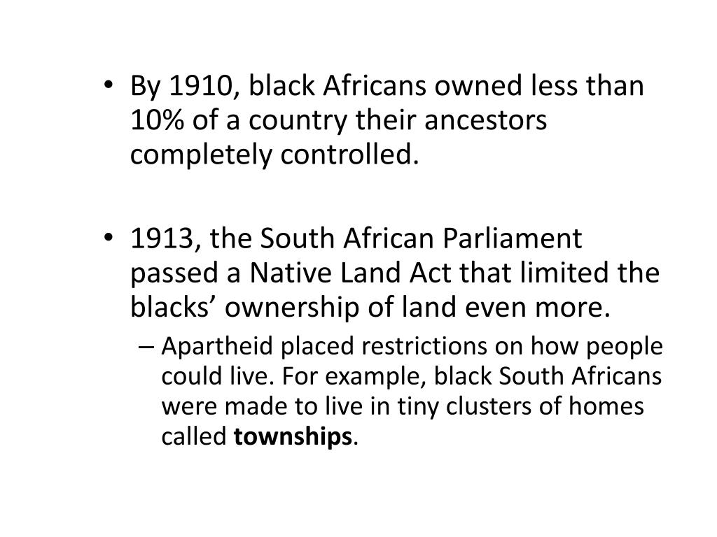 By 1910, black Africans owned less than 10% of a country their ancestors completely controlled. • 1913, the South African Parliament passed a Native Land Act that limited the blacks’ ownership of land even more. • Apartheid placed restrictions on how people could live. For example, black South Africans were made to live in tiny clusters of homes called townships.