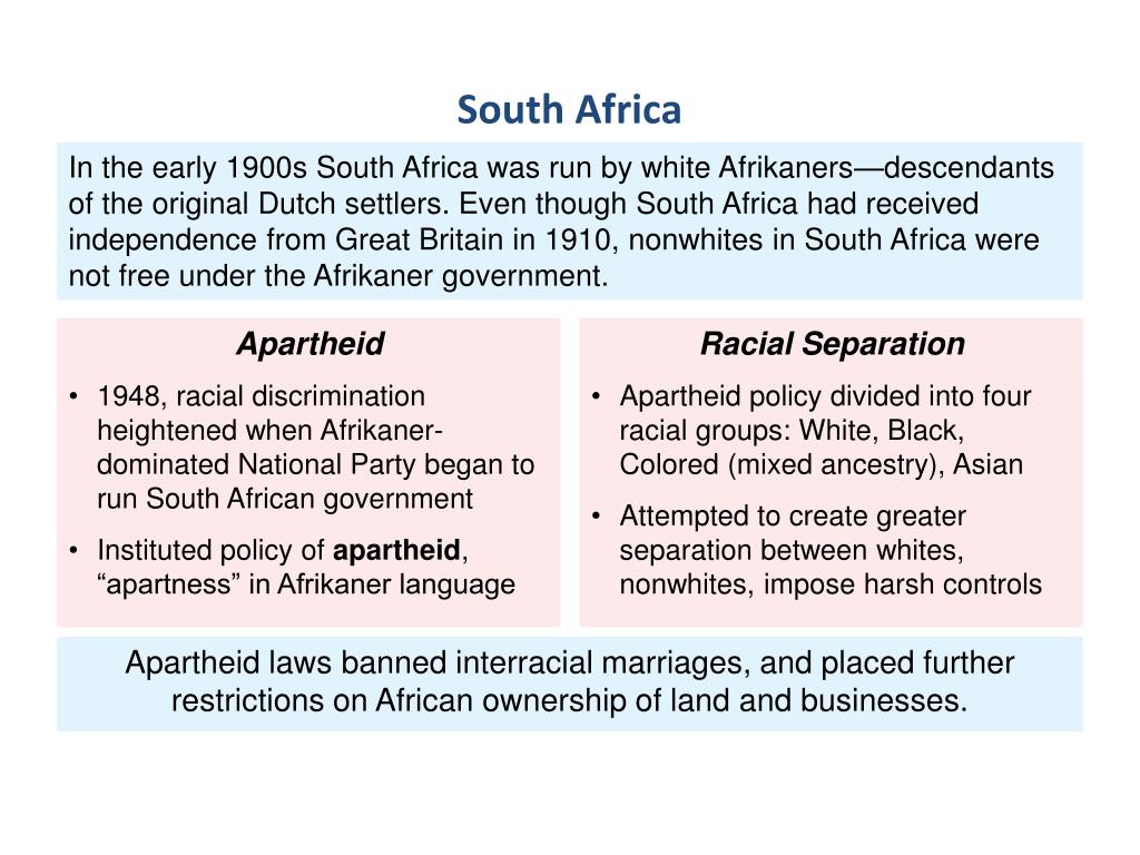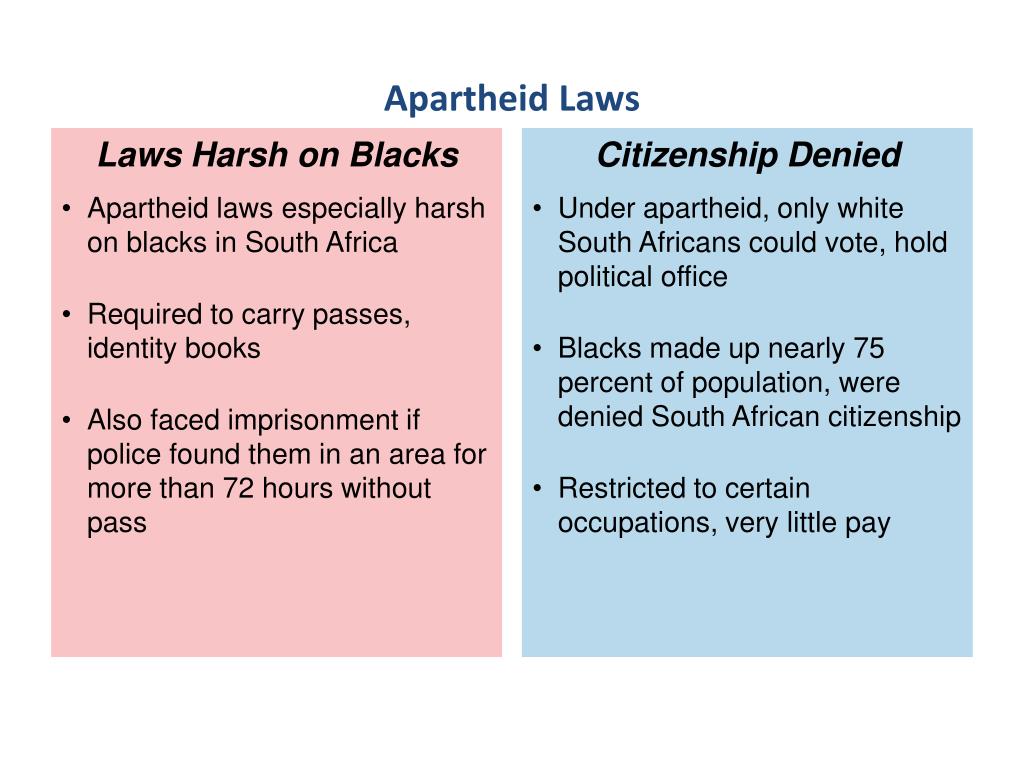 Africans had to be legally classified (Black, White, Colored, Indian) Africans were not allowed to have interracial marriages Africans had to carry registration cards with their race indicated Africans had to be separated publicly (restaurants, hospitals, beaches, theaters, pools, restrooms, etc) Africans also had separate educational systems (lower standards for blacks) Some Rules of Apartheid