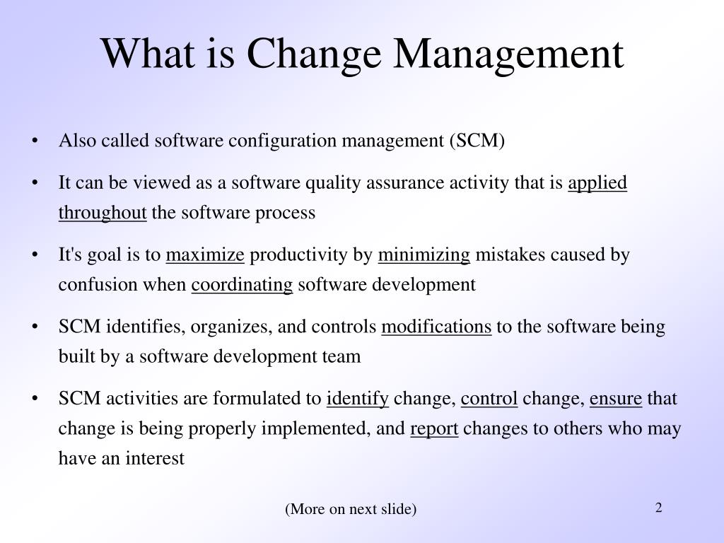 What is Change Management • Also called software configuration management (SCM) • It can be viewed as a software quality assurance activity that is applied throughout the software process • It's goal is to maximize productivity by minimizing mistakes caused by confusion when coordinating software development • SCM identifies, organizes, and controls modifications to the software being built by a software development team • SCM activities are formulated to identify change, control change, ensure that change is being properly implemented, and report changes to others who may have an interest (More on next slide)