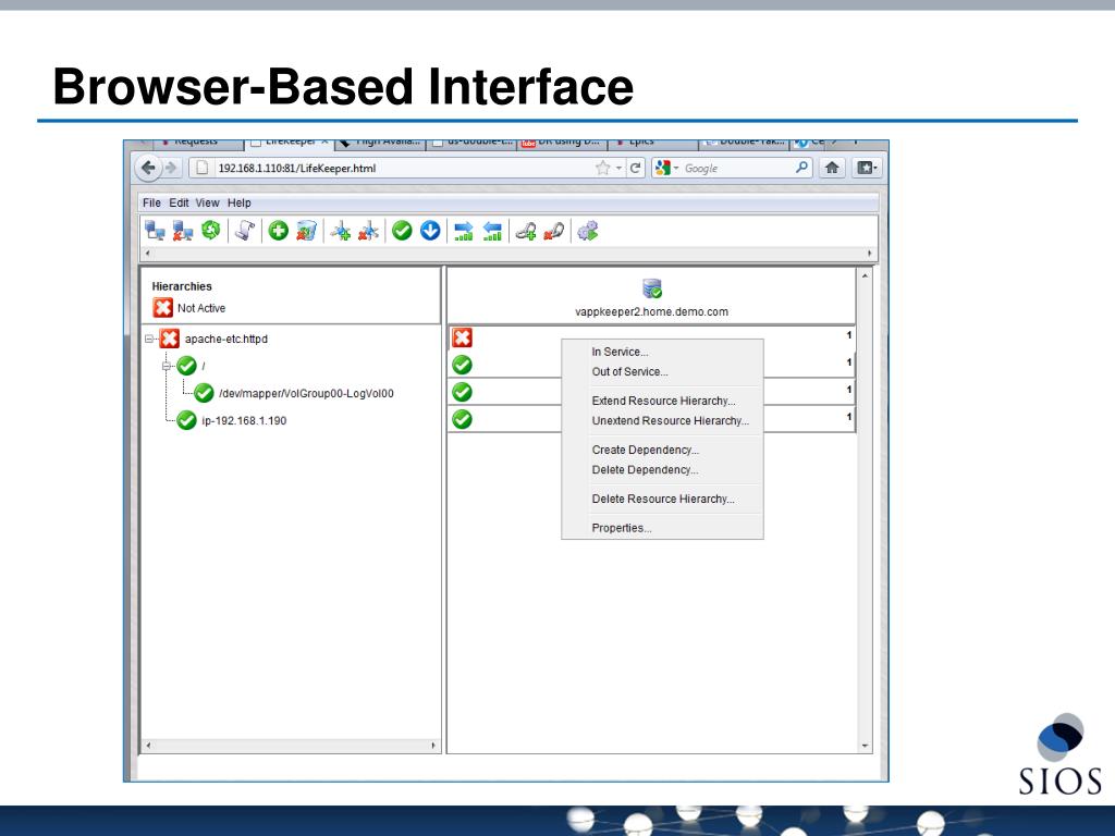 vAppKeeper Overview • GA – November 23, 2011 • Linux-only support in 7.5 • Goals • Strengthen HA position in the market • Initial release of vAppKeeper • Increasing SIOS relevance in VMware environments • Adding application health awareness to VMware HA to improve application availability • Competes with Symantec ApplicationHA • Addressing enterprise customer HA requirements • Policy granularity and flexibility