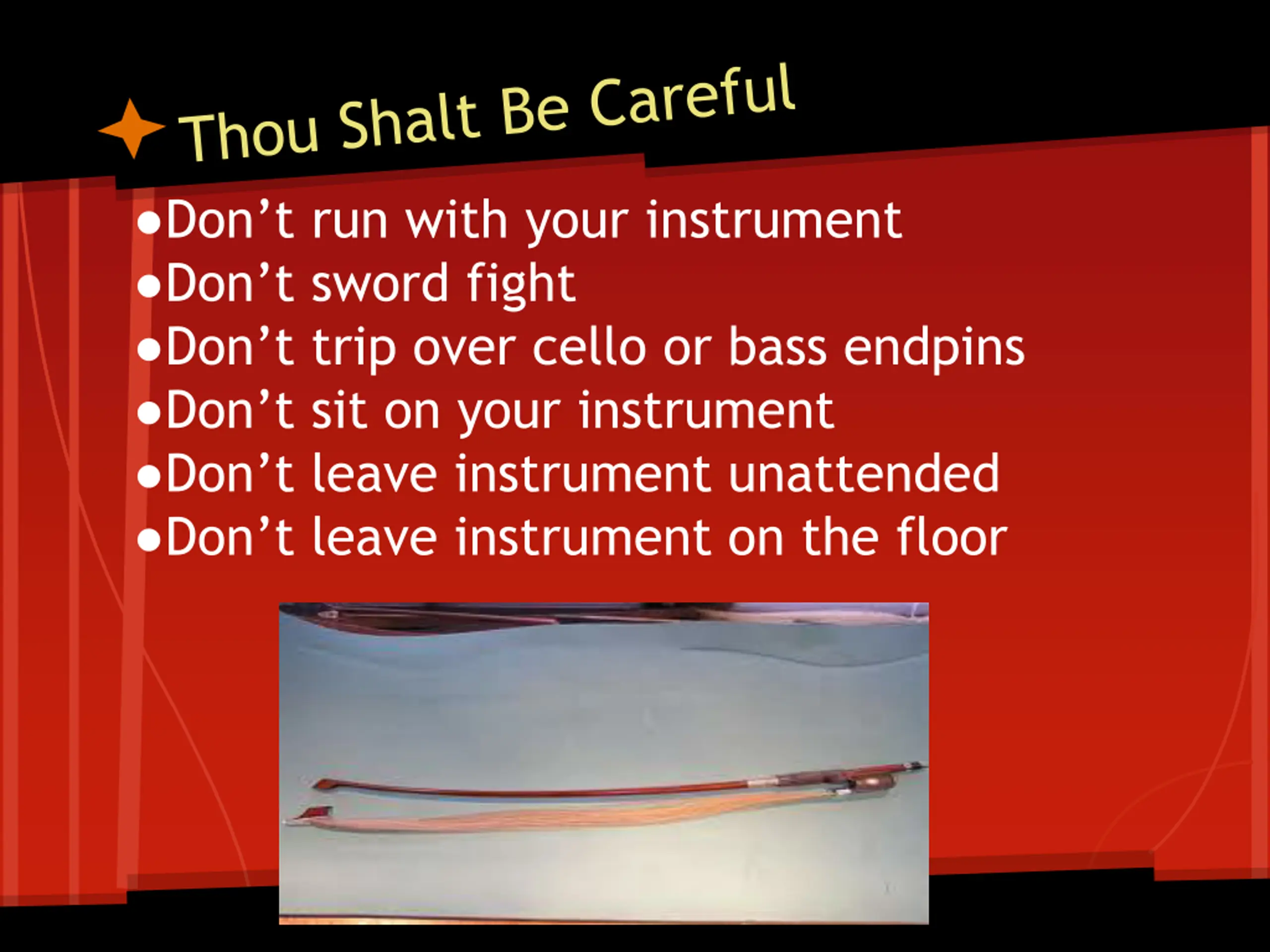 7. ●Don’t run with your instrument ●Don’t sword fight ●Don’t trip over cello or bass endpins ●Don’t sit on your instrument ●Don’t leave instrument unattended ●Don’t leave instrument on the floor
