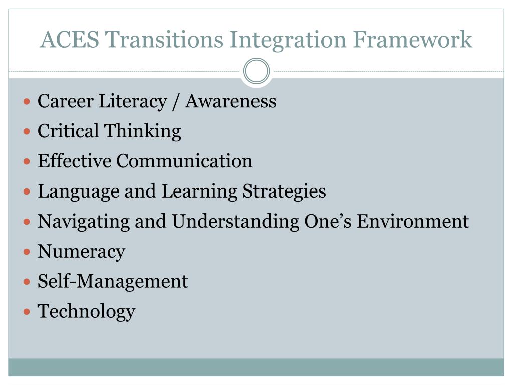 ACES Transitions Integration Framework • Career Literacy / Awareness • Critical Thinking • Effective Communication • Language and Learning Strategies • Navigating and Understanding One’s Environment • Numeracy • Self-Management • Technology