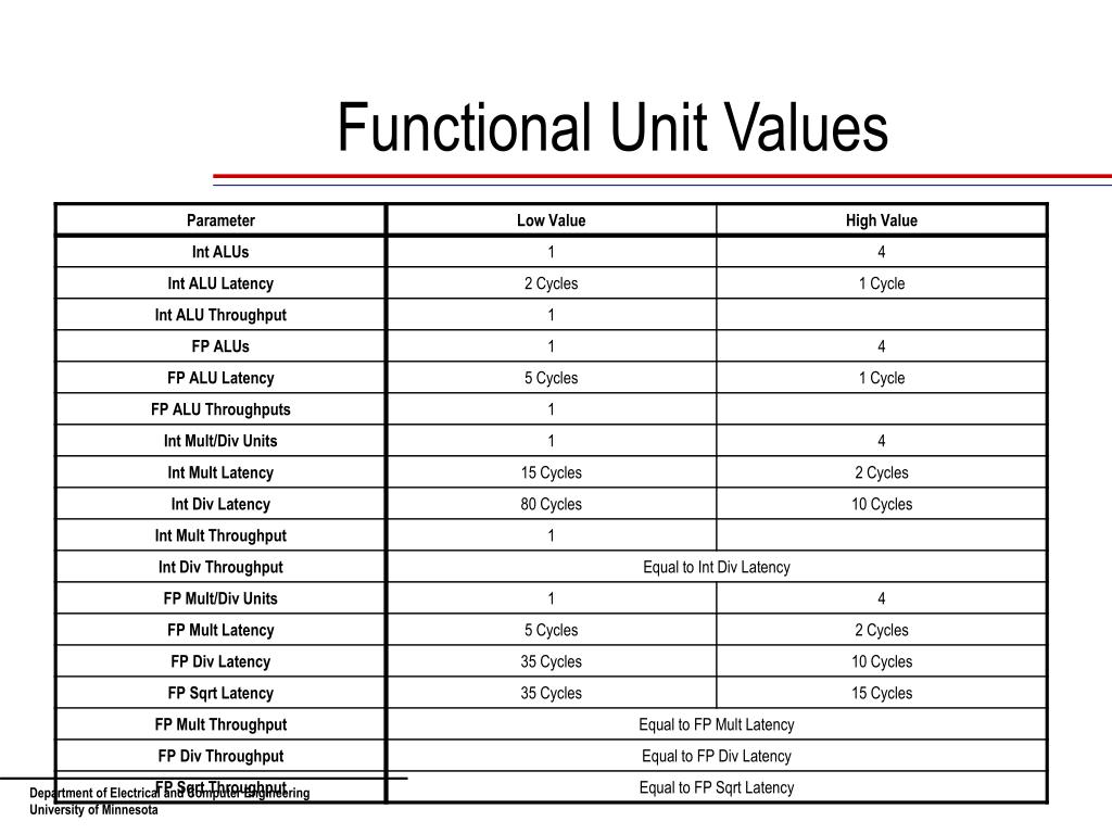 Simulation Environment • SimpleScalar simulator • sim-outorder 3.0 • Selected SPEC 2000 Benchmarks • gzip, vpr, gcc, mesa, art, mcf, equake, parser, vortex, bzip2, twolf • MinneSPEC Reduced Input Sets • Compiled with gcc (PISA) at O3