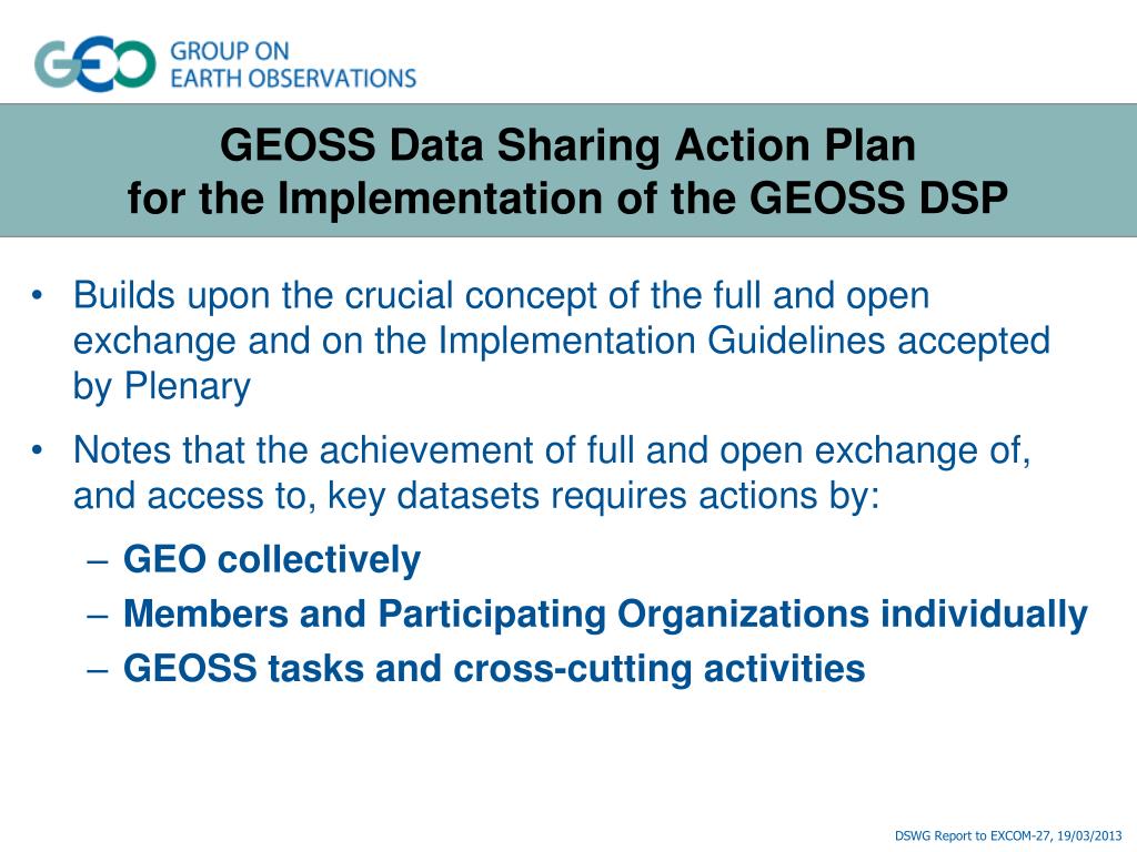 GEOSS Data Sharing Action Planfor the Implementation of the GEOSS DSP • Builds upon the crucial concept of the full and open exchange and on the Implementation Guidelines accepted by Plenary • Notes that the achievement of full and open exchange of, and access to, key datasets requires actions by: • GEO collectively • Members and Participating Organizations individually • GEOSS tasks and cross-cutting activities