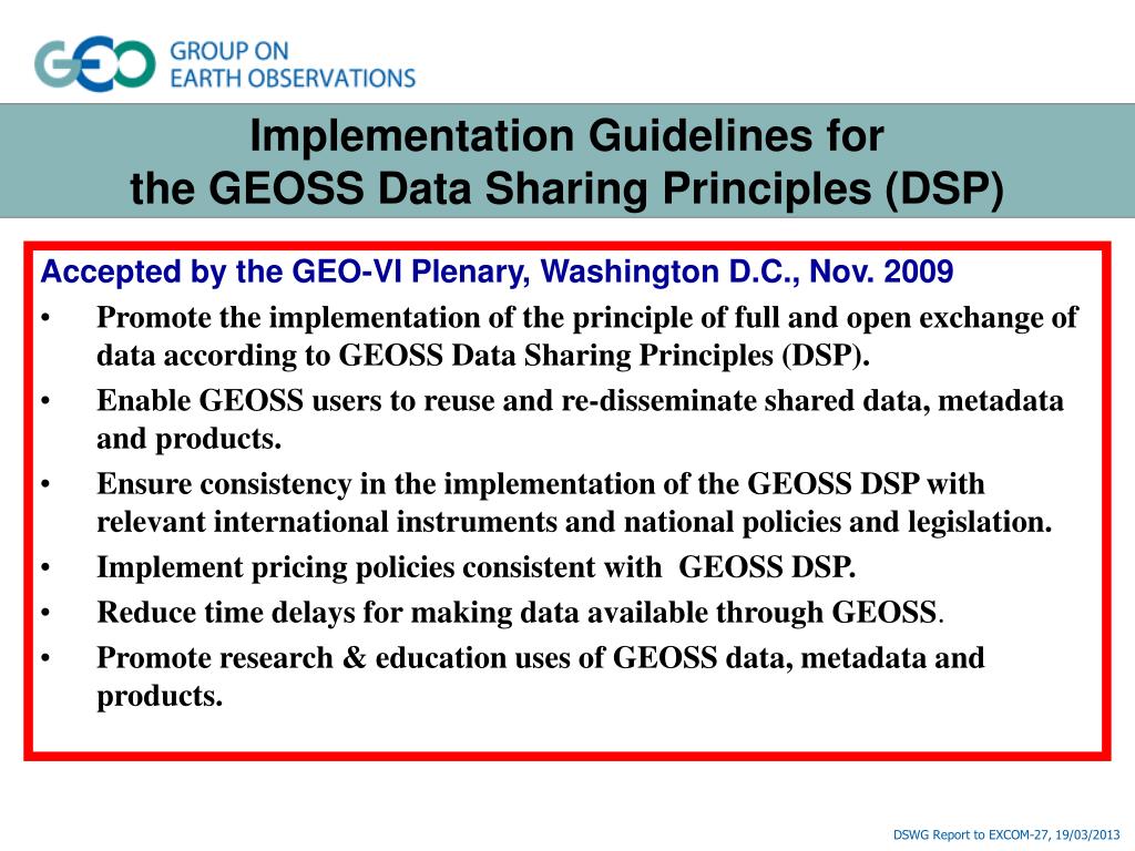 Implementation Guidelines forthe GEOSS Data Sharing Principles (DSP) • Accepted by the GEO-VI Plenary, Washington D.C., Nov. 2009 • Promote the implementation of the principle of full and open exchange of data according to GEOSS Data Sharing Principles (DSP). • Enable GEOSS users to reuse and re-disseminate shared data, metadata and products. • Ensure consistency in the implementation of the GEOSS DSP with relevant international instruments and national policies and legislation. • Implement pricing policies consistent with GEOSS DSP. • Reduce time delays for making data available through GEOSS. • Promote research & education uses of GEOSS data, metadata and products.