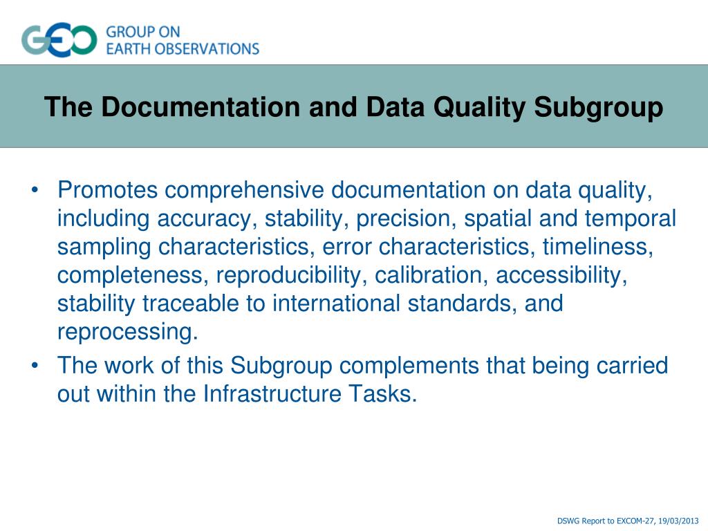 The Documentation and Data Quality Subgroup Promotes comprehensive documentation on data quality, including accuracy, stability, precision, spatial and temporal sampling characteristics, error characteristics, timeliness, completeness, reproducibility, calibration, accessibility, stability traceable to international standards, and reprocessing. The work of this Subgroup complements that being carried out within the Infrastructure Tasks.