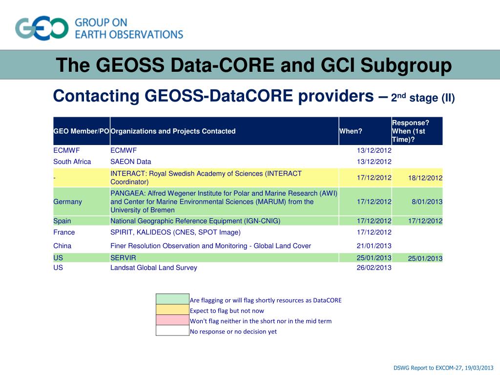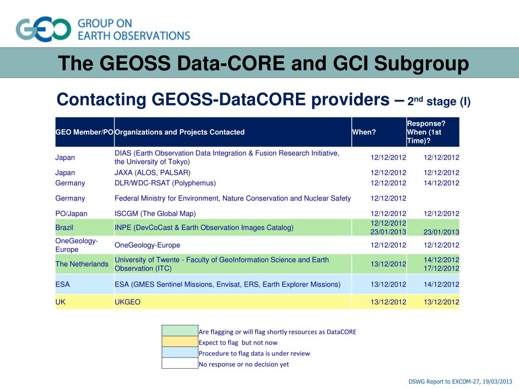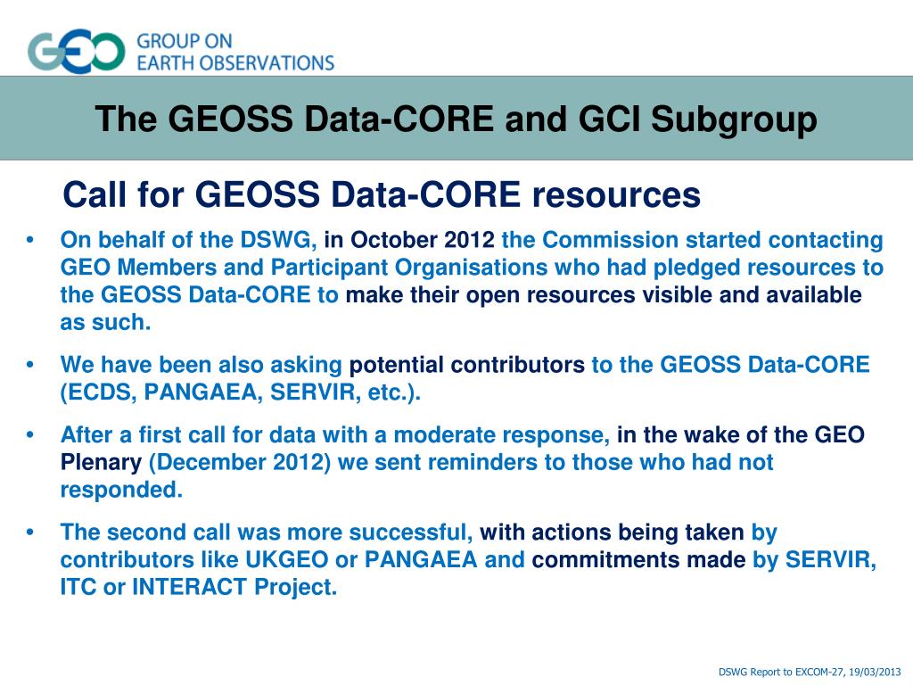 The GEOSS Data-CORE and GCI Subgroup Call for GEOSS Data-CORE resources • On behalf of the DSWG, in October 2012 the Commission started contacting GEO Members and Participant Organisations who had pledged resources to the GEOSS Data-CORE to make their open resources visible and available as such. • We have been also asking potential contributors to the GEOSS Data-CORE (ECDS, PANGAEA, SERVIR, etc.). • After a first call for data with a moderate response, in the wake of the GEO Plenary (December 2012) we sent reminders to those who had not responded. • The second call was more successful, with actions being taken by contributors like UKGEO or PANGAEA and commitments made by SERVIR, ITC or INTERACT Project.