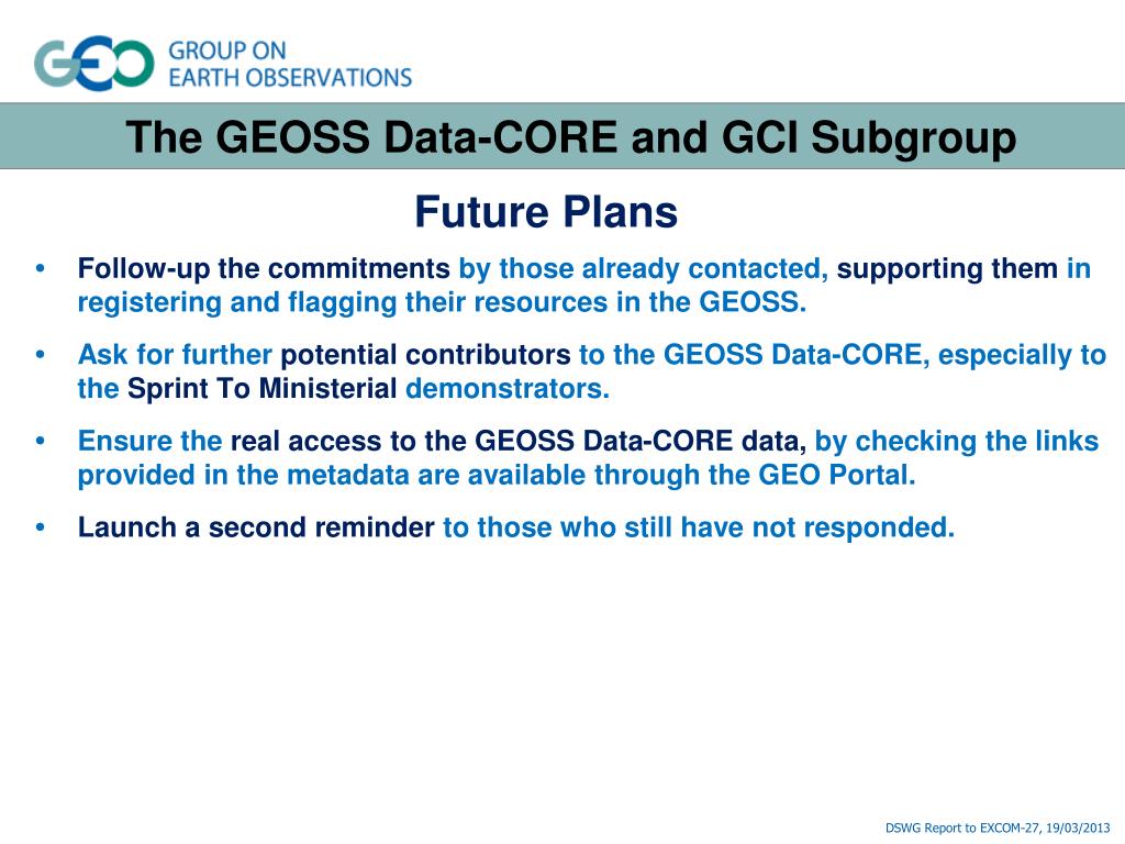 The GEOSS Data-CORE and GCI Subgroup Future Plans • Follow-up the commitments by those already contacted, supporting them in registering and flagging their resources in the GEOSS. • Ask for further potential contributors to the GEOSS Data-CORE, especially to the Sprint To Ministerial demonstrators. • Ensure the real access to the GEOSS Data-CORE data, by checking the links provided in the metadata are available through the GEO Portal. • Launch a second reminder to those who still have not responded.