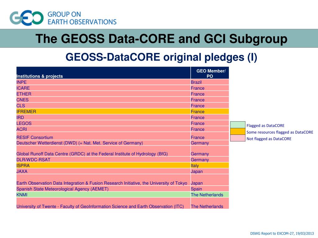 The GEOSS Data-CORE and GCI Subgroup GEOSS-DataCORE original pledges (I)