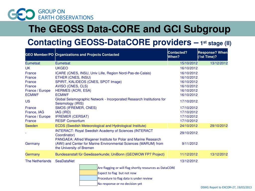 The GEOSS Data-CORE and GCI Subgroup Contacting GEOSS-DataCORE providers – 1st stage (II)