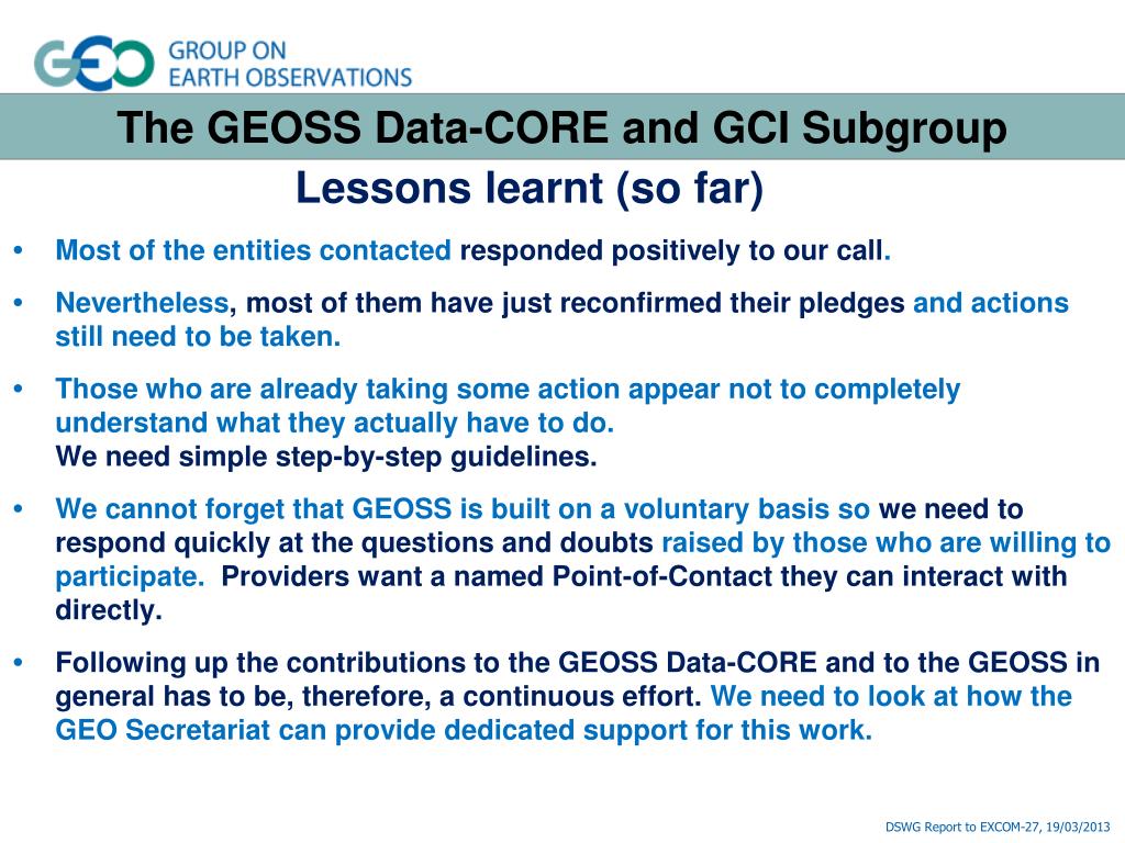 The GEOSS Data-CORE and GCI Subgroup Lessons learnt (so far) • Most of the entities contacted responded positively to our call. • Nevertheless, most of them have just reconfirmed their pledges and actions still need to be taken. • Those who are already taking some action appear not to completely understand what they actually have to do.We need simple step-by-step guidelines. • We cannot forget that GEOSS is built on a voluntary basis so we need to respond quickly at the questions and doubts raised by those who are willing to participate. Providers want a named Point-of-Contact they can interact with directly. • Following up the contributions to the GEOSS Data-CORE and to the GEOSS in general has to be, therefore, a continuous effort. We need to look at how the GEO Secretariat can provide dedicated support for this work.