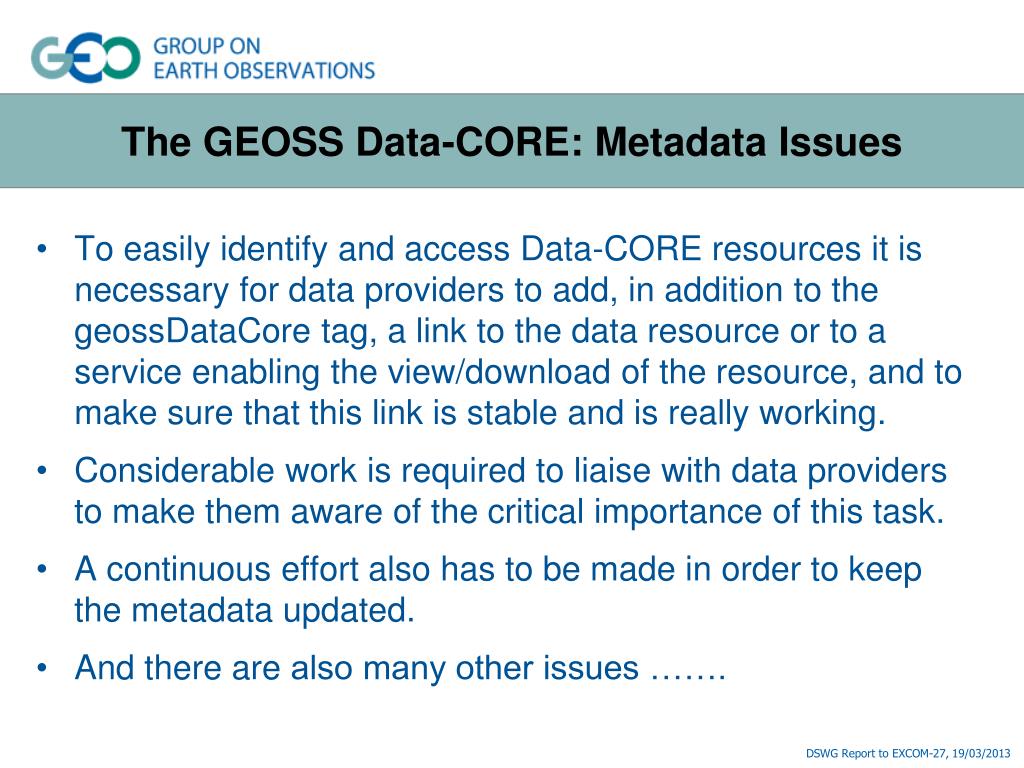 The GEOSS Data-CORE: Metadata Issues • To easily identify and access Data-CORE resources it is necessary for data providers to add, in addition to the geossDataCore tag, a link to the data resource or to a service enabling the view/download of the resource, and to make sure that this link is stable and is really working. • Considerable work is required to liaise with data providers to make them aware of the critical importance of this task. • A continuous effort also has to be made in order to keep the metadata updated. • And there are also many other issues …….