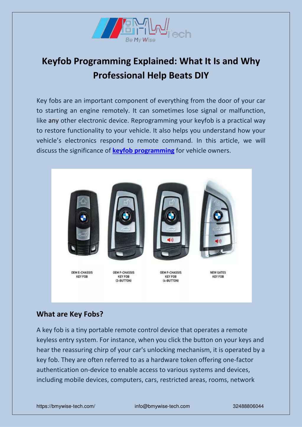 Keyfob Programming Explained: What It Is and Why Professional Help Beats DIY Key fobs are an important component of everything from the door of your car to starting an engine remotely. It can sometimes lose signal or malfunction, like any other electronic device. Reprogramming your keyfob is a practical way to restore functionality to your vehicle. It also helps you understand how your vehicle’s electronics respond to remote command. In this article, we will discuss the significance of keyfob programming for vehicle owners. What are Key Fobs? A key fob is a tiny portable remote control device that operates a remote keyless entry system. For instance, when you click the button on your keys and hear the reassuring chirp of your car's unlocking mechanism, it is operated by a key fob. They are often referred to as a hardware token offering one-factor authentication on-device to enable access to various systems and devices, including mobile devices, computers, cars, restricted areas, rooms, network https://bmywise-tech.com/ info@bmywise-tech.com32488806044