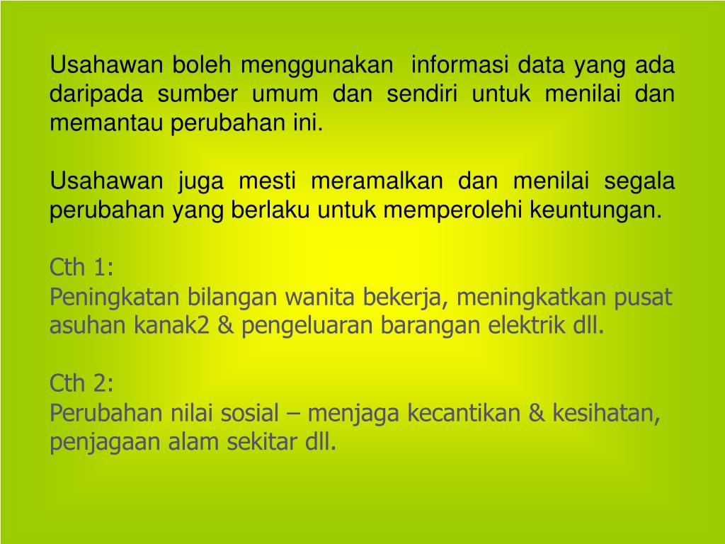 Usahawan boleh menggunakan informasi data yang ada daripada sumber umum dan sendiri untuk menilai dan memantau perubahan ini. Usahawan juga mesti meramalkan dan menilai segala perubahan yang berlaku untuk memperolehi keuntungan. Cth 1: Peningkatan bilangan wanita bekerja, meningkatkan pusat asuhan kanak2 & pengeluaran barangan elektrik dll. Cth 2: Perubahan nilai sosial – menjaga kecantikan & kesihatan, penjagaan alam sekitar dll.
