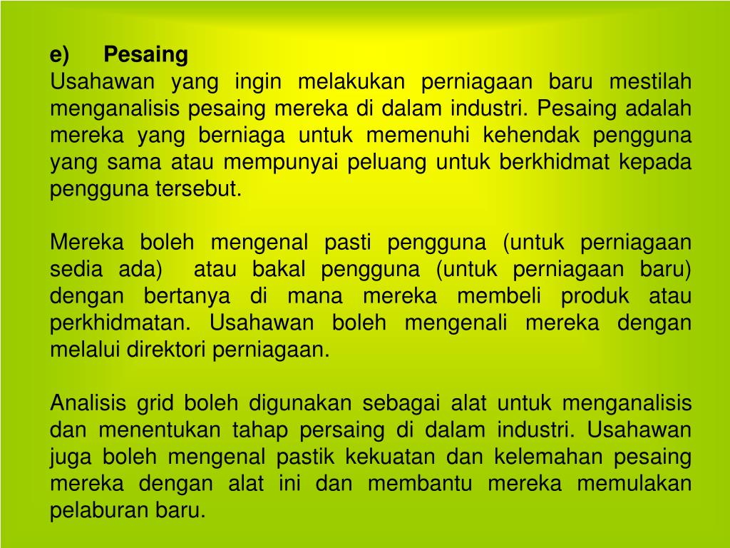 e)Pesaing Usahawan yang ingin melakukan perniagaan baru mestilah menganalisis pesaing mereka di dalam industri. Pesaing adalah mereka yang berniaga untuk memenuhi kehendak pengguna yang sama atau mempunyai peluang untuk berkhidmat kepada pengguna tersebut. Mereka boleh mengenal pasti pengguna (untuk perniagaan sedia ada) atau bakal pengguna (untuk perniagaan baru) dengan bertanya di mana mereka membeli produk atau perkhidmatan. Usahawan boleh mengenali mereka dengan melalui direktori perniagaan. Analisis grid boleh digunakan sebagai alat untuk menganalisis dan menentukan tahap persaing di dalam industri. Usahawan juga boleh mengenal pastik kekuatan dan kelemahan pesaing mereka dengan alat ini dan membantu mereka memulakan pelaburan baru.