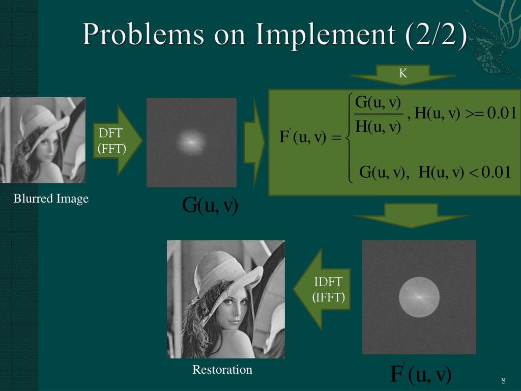 Problems on Implement (2/2) K DFT (FFT) Blurred Image IDFT (IFFT) Restoration
