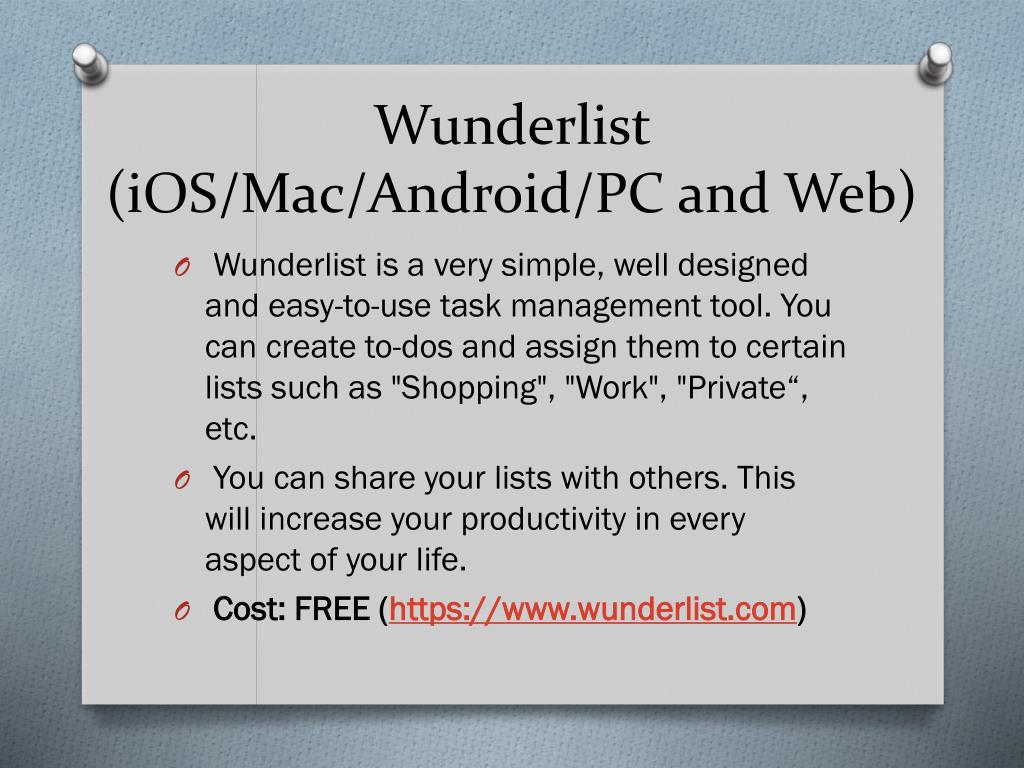 Wunderlist (iOS/Mac/Android/PC and Web) • Wunderlistis a very simple, well designed and easy-to-use task management tool. You can create to-dos and assign them to certain lists such as "Shopping", "Work", "Private“, etc. • You can share your lists with others. This will increase your productivity in every aspect of your life. • Cost: FREE (https://www.wunderlist.com)