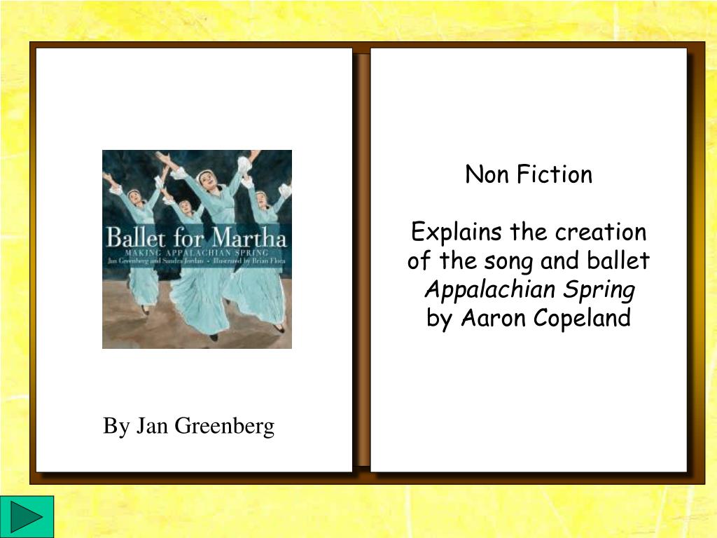 Non Fiction Explains the creation of the song and ballet Appalachian Spring by Aaron Copeland By Jan Greenberg