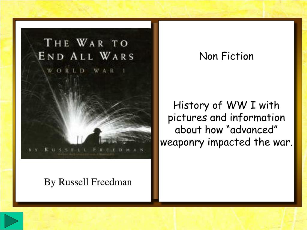 Non Fiction History of WW I with pictures and information about how “advanced” weaponry impacted the war. By Russell Freedman