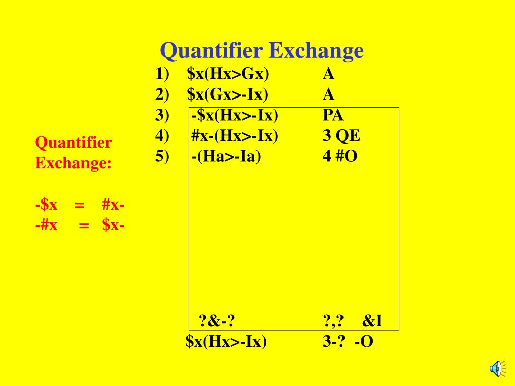 Quantifier Exchange 1) $x(Hx>Gx) A 2) $x(Gx>-Ix) A 3) -$x(Hx>-Ix) PA 4) #x-(Hx>-Ix) 3 QE The part after the quantifier stays the same. ?&-? ?,? &I $x(Hx>-Ix) 3-? -O Quantifier Exchange: -$x = #x- -#x = $x-