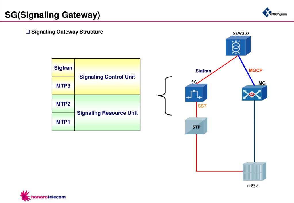 SG(Signaling Gateway) Signaling Gateway Structure SSW2.0 Sigtran Signaling Control Unit MGCP Sigtran MTP3 SG MG MTP2 Signaling Resource Unit SS7 MTP1 STP 교환기