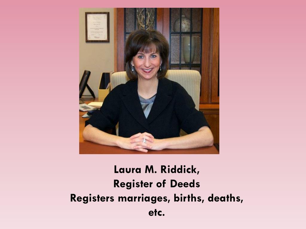 Laura M. Riddick,Register of DeedsRegisters marriages, births, deaths, etc.