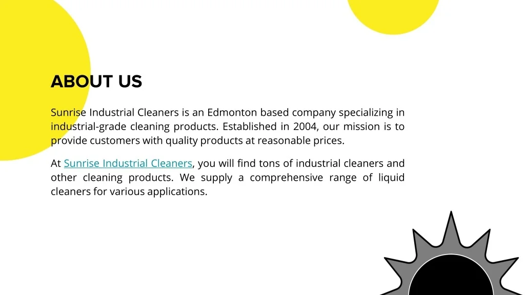 ABOUT US Sunrise Industrial Cleaners is an Edmonton based company specializing in industrial-grade cleaning products. Established in 2004, our mission is to provide customers with quality products at reasonable prices. At Sunrise Industrial Cleaners, you will find tons of industrial cleaners and other cleaning products. We supply a comprehensive range of liquid cleaners for various applications.