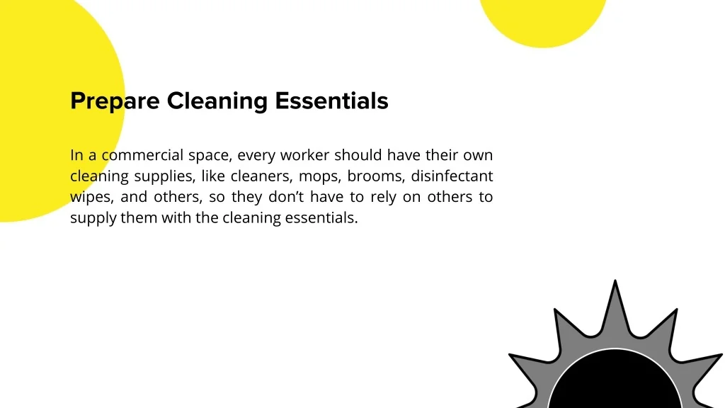 Prepare Cleaning Essentials In a commercial space, every worker should have their own cleaning supplies, like cleaners, mops, brooms, disinfectant wipes, and others, so they don’t have to rely on others to supply them with the cleaning essentials.