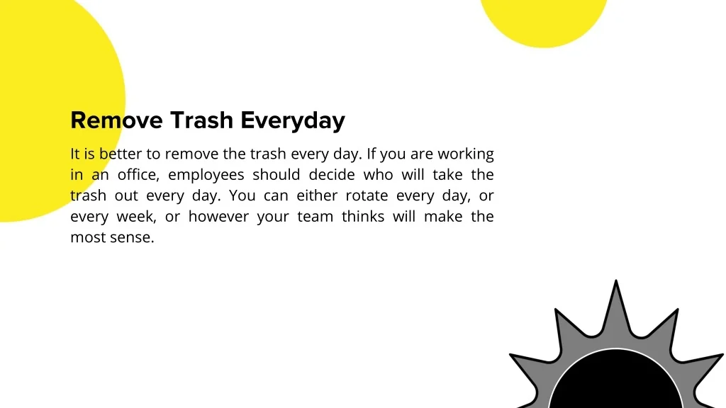 Remove Trash Everyday It is better to remove the trash every day. If you are working in an office, employees should decide who will take the trash out every day. You can either rotate every day, or every week, or however your team thinks will make the most sense.