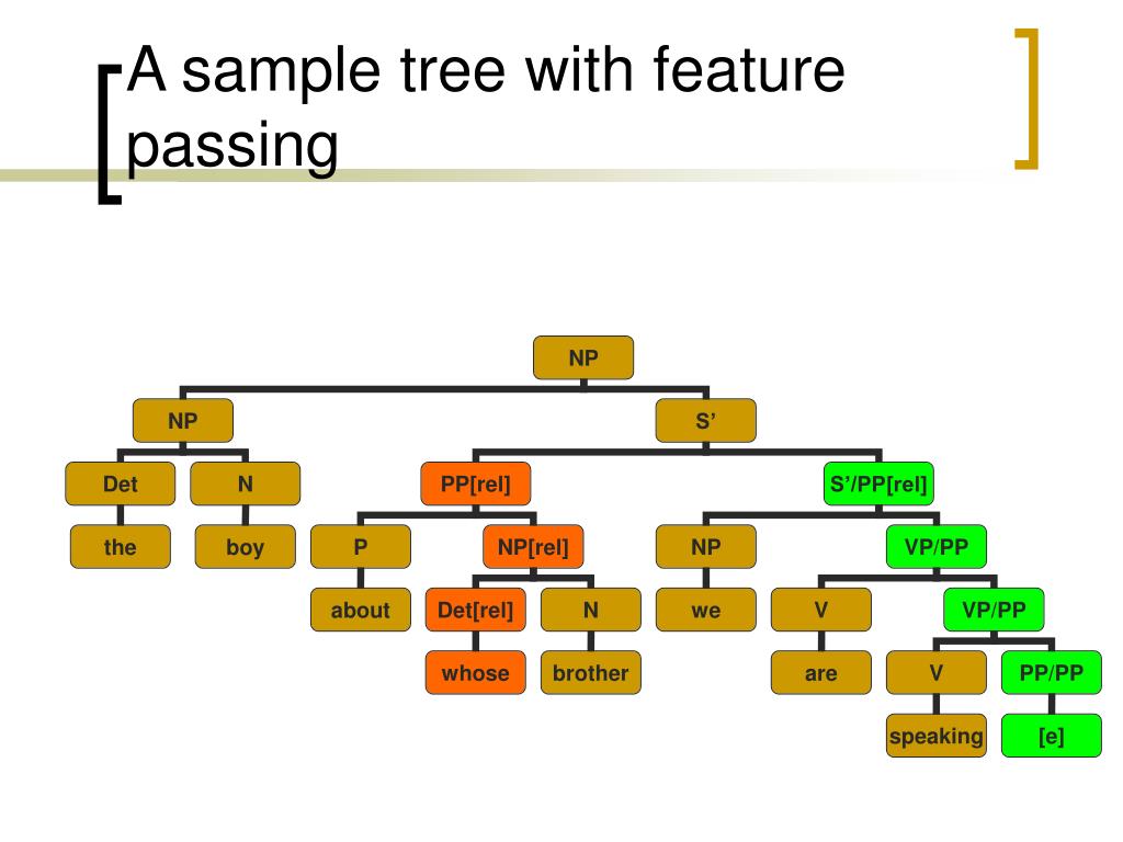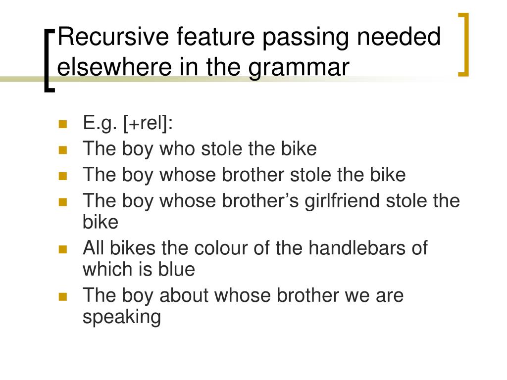 Recursive feature passing needed elsewhere in the grammar • E.g. [+rel]: • The boy who stole the bike • The boy whose brother stole the bike • The boy whose brother’s girlfriend stole the bike • All bikes the colour of the handlebars of which is blue • The boy about whose brother we are speaking