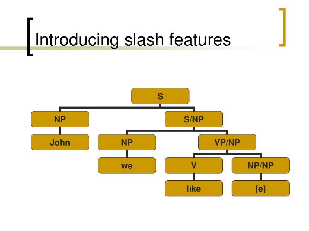 GPSG: Generalized Phrase Structure Grammar • Let G be a context-free grammar • For each rule A -> B C add new rules A/D -> B C/D and A/D -> B/D C (metarule) • And as well as: X/X -> [e] (for all X) (slash termination) • And: S -> XP S/XP (slash introduction)