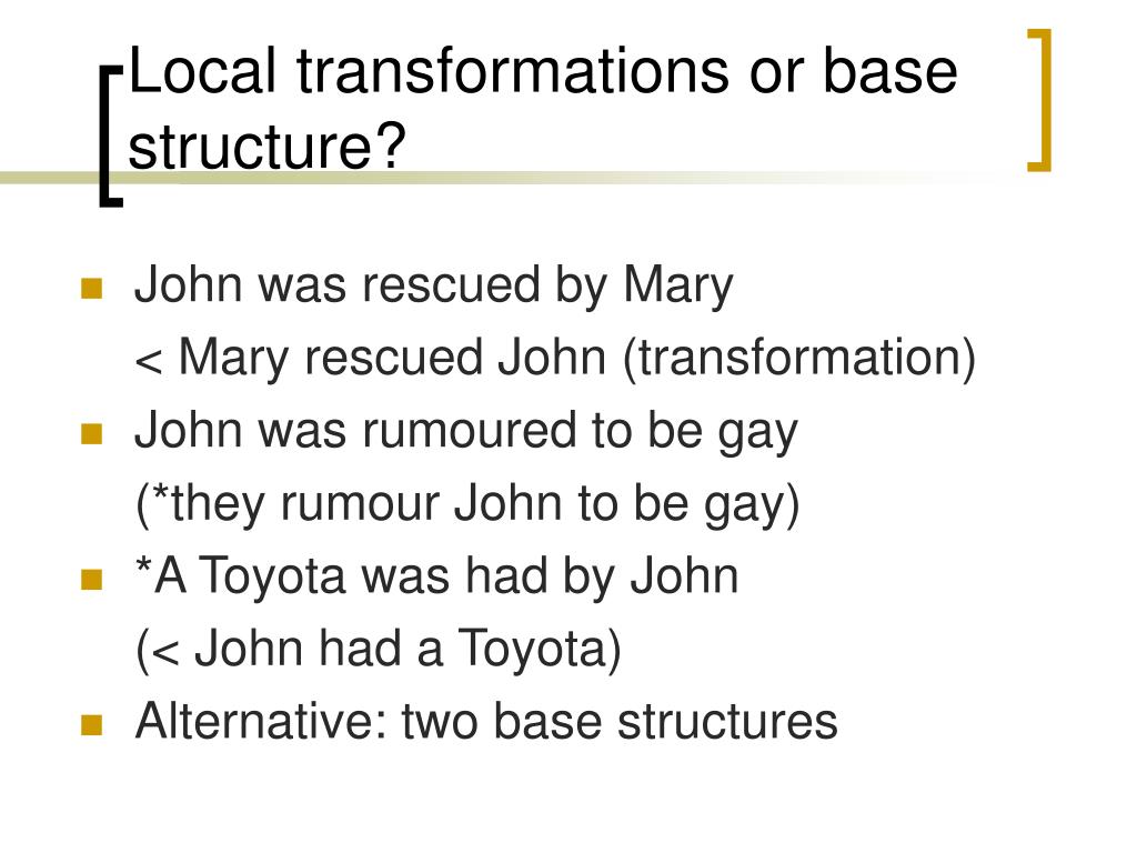 Local transformations or base structure? • John was rescued by Mary < Mary rescued John (transformation) • John was rumoured to be gay (*they rumour John to be gay) • *A Toyota was had by John (< John had a Toyota) • Alternative: two base structures