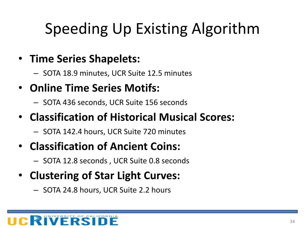 Speeding Up Existing Algorithm • Time Series Shapelets: • SOTA 18.9 minutes, UCR Suite 12.5 minutes • Online Time Series Motifs: • SOTA 436 seconds, UCR Suite 156 seconds • Classification of Historical Musical Scores: • SOTA 142.4 hours, UCR Suite 720 minutes • Classification of Ancient Coins: • SOTA 12.8 seconds , UCR Suite 0.8 seconds • Clustering of Star Light Curves: • SOTA 24.8 hours, UCR Suite 2.2 hours
