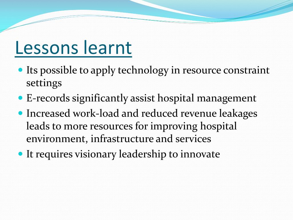 Lessons learnt • Its possible to apply technology in resource constraint settings • E-records significantly assist hospital management • Increased work-load and reduced revenue leakages leads to more resources for improving hospital environment, infrastructure and services • It requires visionary leadership to innovate
