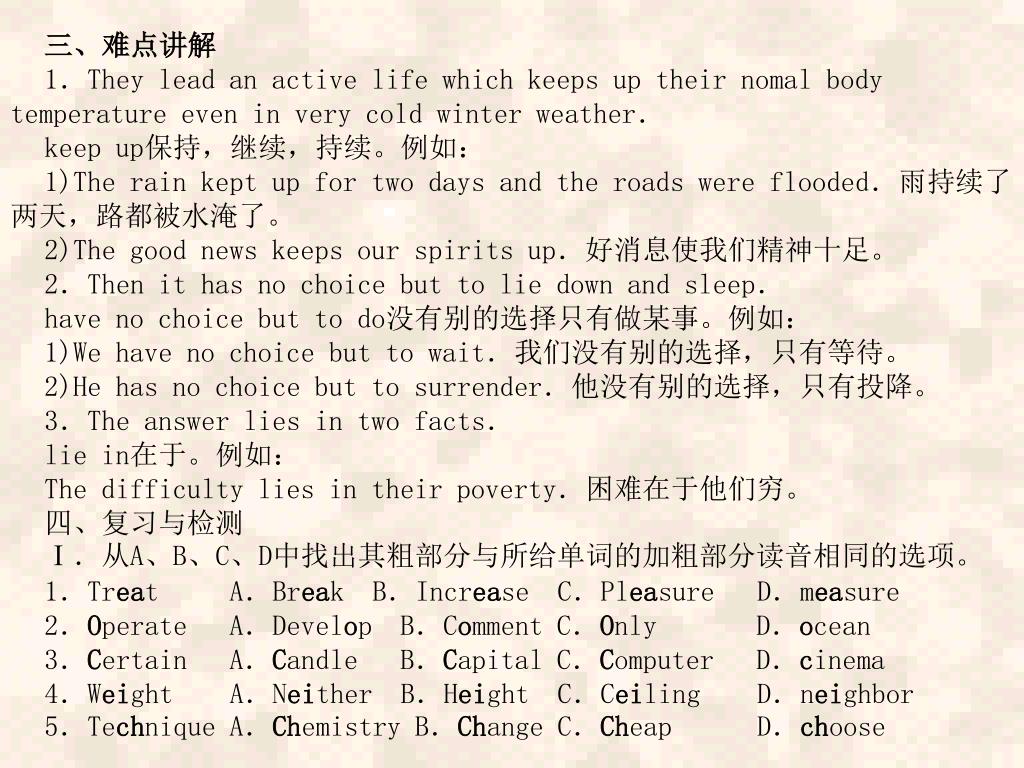 三、难点讲解 1.They lead an active life which keeps up their nomal body temperature even in very cold winter weather. keep up保持,继续,持续。例如: 1)The rain kept up for two days and the roads were flooded.雨持续了两天,路都被水淹了。 2)The good news keeps our spirits up.好消息使我们精神十足。 2.Then it has no choice but to lie down and sleep. have no choice but to do没有别的选择只有做某事。例如: 1)We have no choice but to wait.我们没有别的选择,只有等待。 2)He has no choice but to surrender.他没有别的选择,只有投降。 3.The answer lies in two facts. lie in在于。例如: The difficulty lies in their poverty.困难在于他们穷。 四、复习与检测 Ⅰ.从A、B、C、D中找出其粗部分与所给单词的加粗部分读音相同的选项。 1.Treat A.Break B.Increase C.Pleasure D.measure 2.Operate A.Develop B.Comment C.Only D.ocean 3.Certain A.Candle B.Capital C.Computer D.cinema 4.Weight A.Neither B.Height C.Ceiling D.neighbor 5.Technique A.Chemistry B.Change C.Cheap D.choose