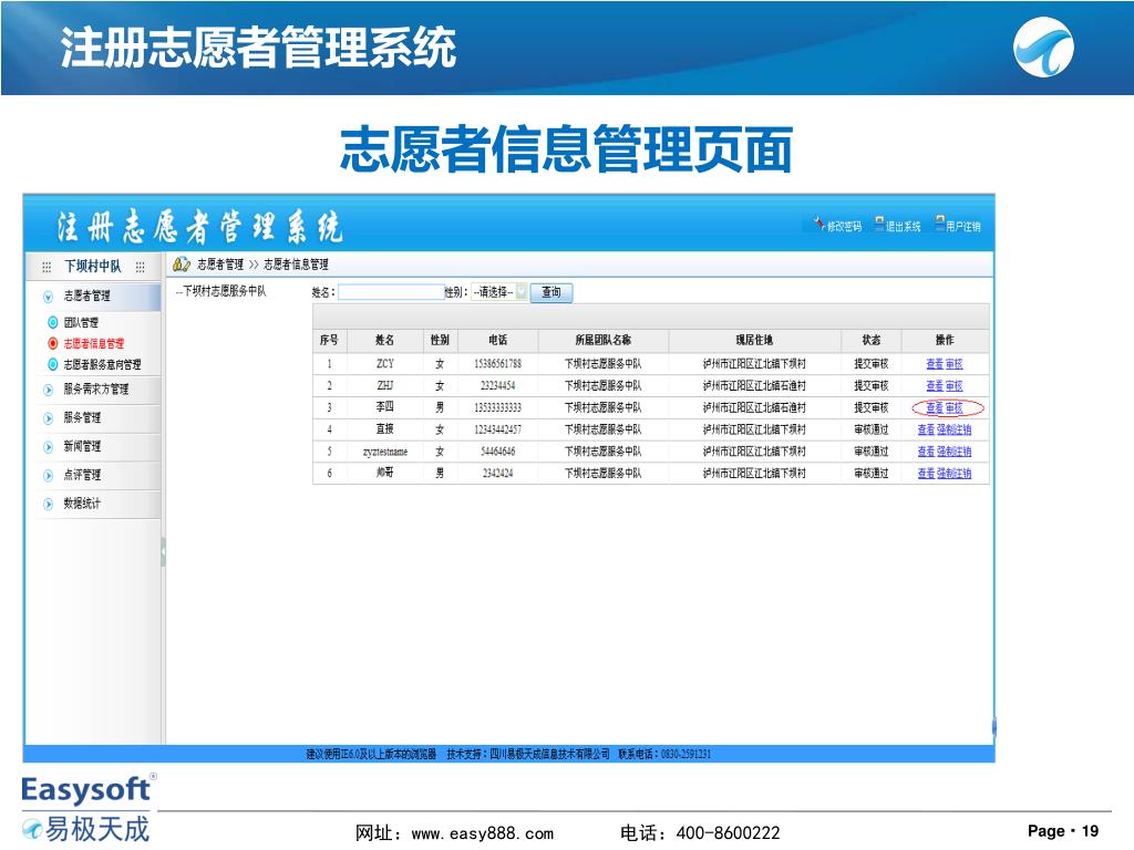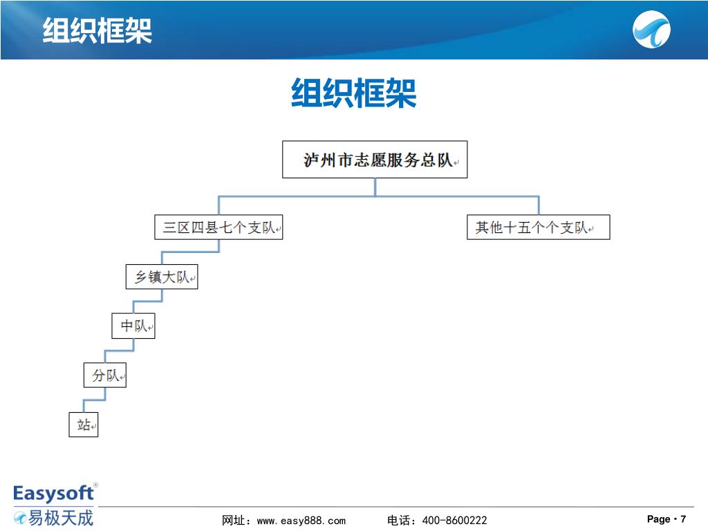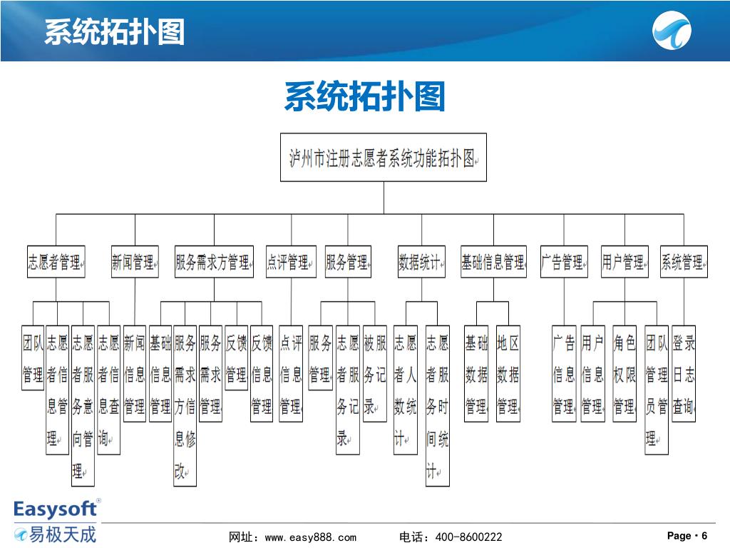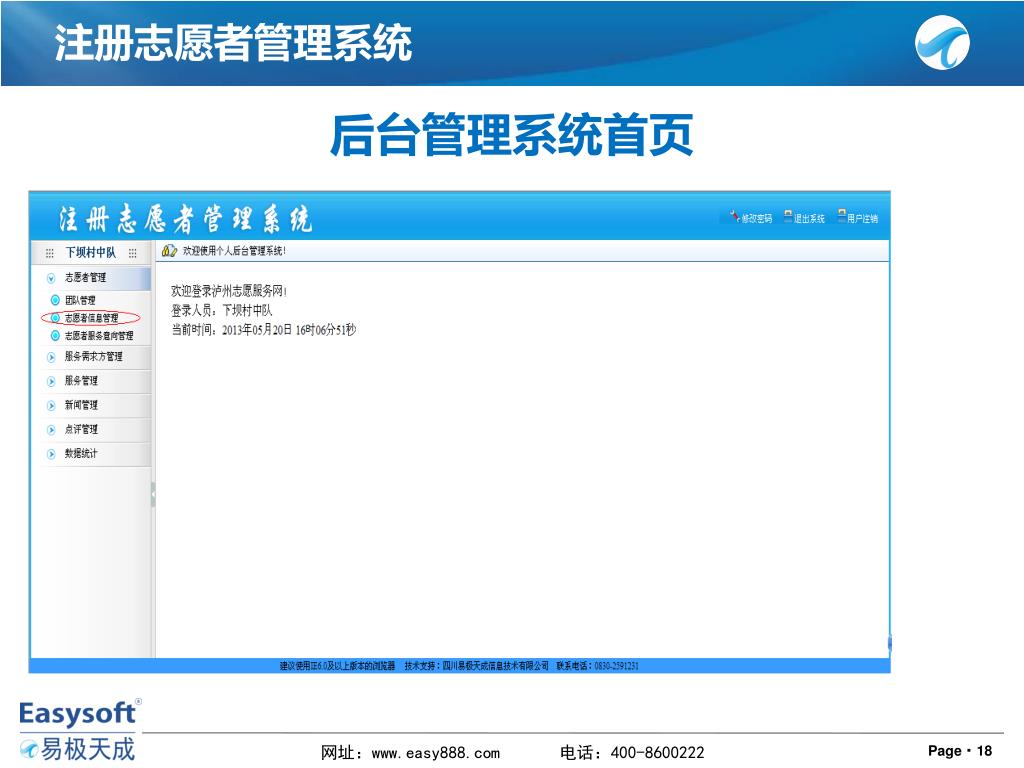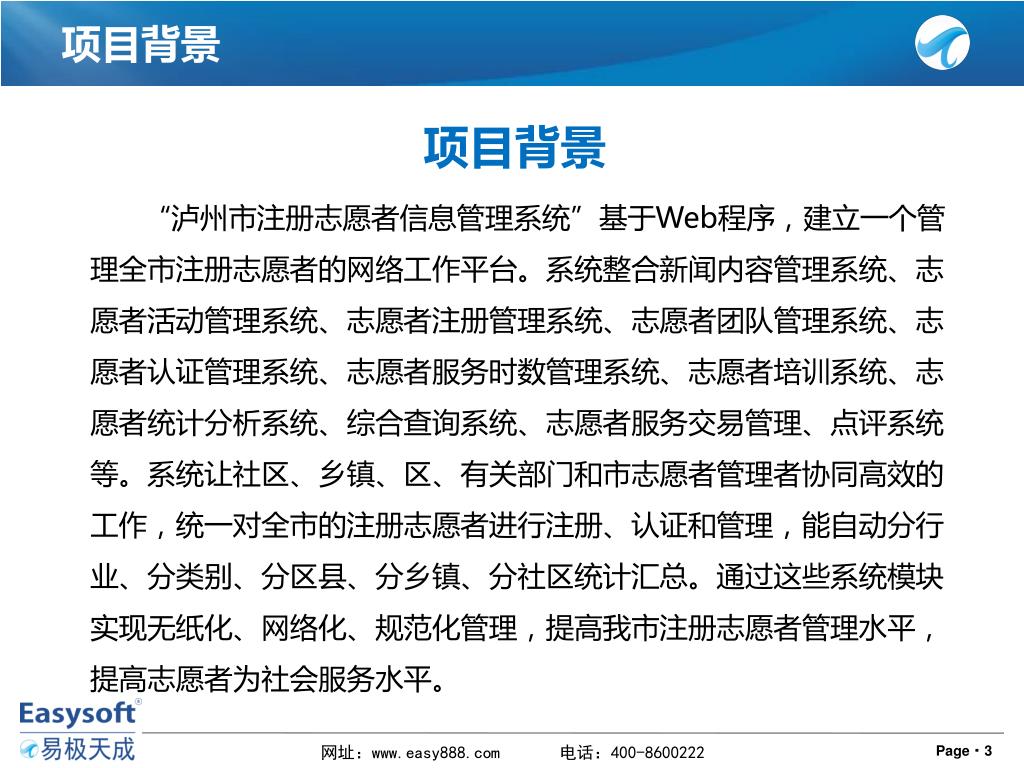项目背景 项目背景 “泸州市注册志愿者信息管理系统”基于Web程序,建立一个管理全市注册志愿者的网络工作平台。系统整合新闻内容管理系统、志愿者活动管理系统、志愿者注册管理系统、志愿者团队管理系统、志愿者认证管理系统、志愿者服务时数管理系统、志愿者培训系统、志愿者统计分析系统、综合查询系统、志愿者服务交易管理、点评系统等。系统让社区、乡镇、区、有关部门和市志愿者管理者协同高效的工作,统一对全市的注册志愿者进行注册、认证和管理,能自动分行业、分类别、分区县、分乡镇、分社区统计汇总。通过这些系统模块实现无纸化、网络化、规范化管理,提高我市注册志愿者管理水平,提高志愿者为社会服务水平。